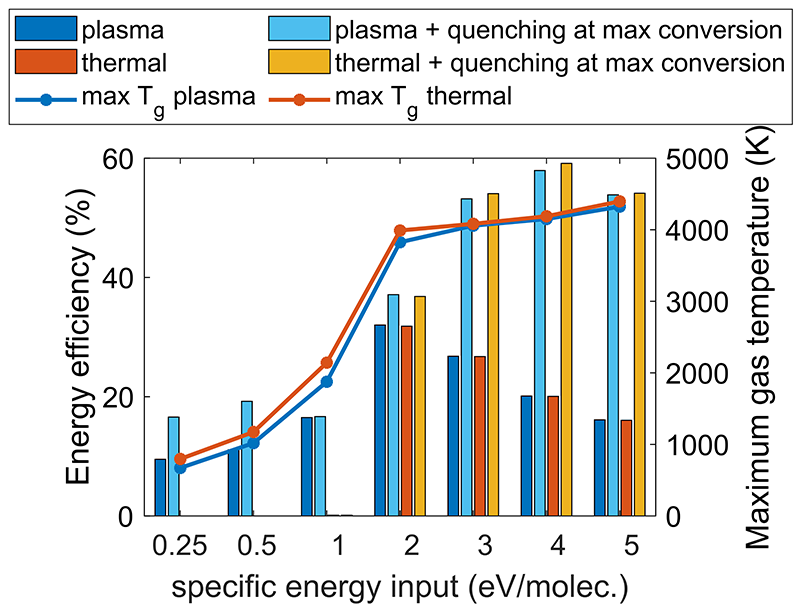 Plasma technology is gaining increasing interest for CO2 conversion. The gas temperature in (and after) the plasma reactor largely affects the performance. We compared plasma-based conversion to pure thermal conversion. For warm plasmas with typical temperatures of 3000−4000 K, the conversion is roughly thermal. We also studied the effect of cooling/quenching, during and after the plasma, on the CO2 conversion and energy efficiency, by means of chemical kinetics modeling. We showed that quenching can even increase the conversion beyond the dissociation in the plasma, known as super-ideal quenching.