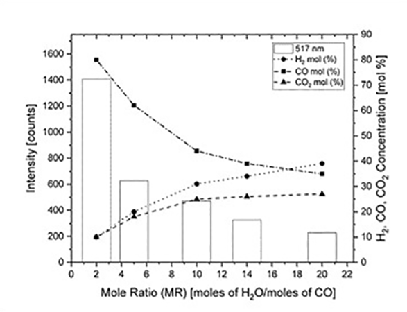 This work explores the use of an atmospheric pressure, low temperature, cold non-thermal plasma (obtained by dielectric barrier discharge (DBD)) to achieve a water-gas shift (WGS) reaction (CO + H2O ↔ H2 + CO2). This work establishes the use of a DBD to generate hydroxyl radicals that initiate and enhance the WGS reaction at low temperatures. The effect of the steam to CO molar ratio (MR) and the gas residence time on the CO conversion (XCO) to H2 was studied. The results show that, at an MR of 20, with 2600 ms of gas residence time and a plasma power of 70 W, a maximum CO conversion of 63 ± 4% can be achieved with an H2 concentration of 48 ± 2 mol% in the product. Preliminary studies of reaction pathways for the enhanced hydrogen formation confirm the role of C formed from the CO2 dissociation. A reaction mechanism for the plasma WGS reaction is proposed and the hydrogen yield is calculated.