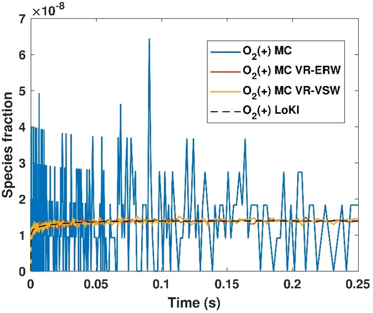 As a first step to achieve such unified formulation, a KMC algorithm to solve gas-phase chemistry was implemented and validated in the thermodynamic limit. However, the densities of the minority species have considerable fluctuations. Two novel variance-reduction methods (ERW and VSW) were developed to circumvent this problem. They significantly improve the description of the minority species in relation to the standard method, as illustrated in the figure for O2+ ions, with gains in computational time by a factor of about 104.