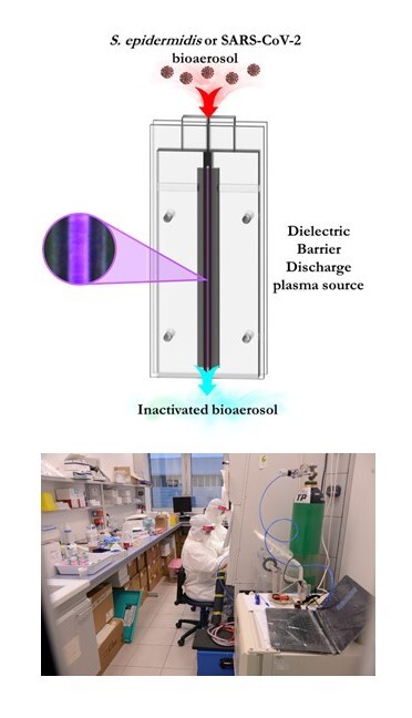 Among the COVID-19 pandemic spreading routes, airborne transmission seems to have a key role as highlighted by the growing evidence that SARS-CoV-2 virus can survive indoor in aerosolized microdroplets up to 3 hours, travelling many meters. Cold atmospheric pressure plasmas (CAPs) represent a promising solution to combat airborne transmission, thanks to their ability to produce a blend of many reactive species, which have antimicrobial properties. Recently, our research team evaluated the efficacy of a lab-scale dielectric barrier discharge plasma device in the inactivation of aerosolized Staphylococcus epidermidis and purified RNA of SARS-CoV-2. Results (through bacterial log reduction and RT-PCR assay, respectively) show that direct contact between plasma and bioaerosol can induce a log R around 3.76 on bacteria and fully degrade viral RNA, with a particle residence time in the discharge zone of 0.18 seconds. In the frame of a Region Emilia-Romagna funded industrial research and innovation project to combat the spread of COVID-19, investigations on the effects of CAPs on bioaerosols containing viable SARS-CoV-2 virus have been conducted in the Class III biological safety lab of the Microbiology Unit, Great Romagna Hub Laboratory, Pievesestina, Italy. Results show a complete reduction of the virus infectivity induced by CAP treatment (results soon to be published).
