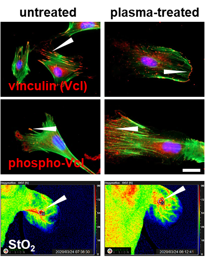 Substantial gene expression changes accompanied gas plas-ma-driven migration and the spreading of skin cells together with dynamic regulation of integrin adhesions. These results were supported by finding i) phosphorylation of the focal ad-hesion kinase and paxillin, ii) alterations of structural pro-teins (e.g., vinculin) and actin organization, and iii) for-mation of new cell-matrix contacts. Gas plasma-derived ROS promote the physical integrity of healed skin, presuma-bly via modulation of collagen deposition, the extracellular matrix degradation, and a wound healing stage-dependent regulation of proteinases (e.g., MMPs). This was attended by an enhanced oxygenation and tissue-hemoglobin perfusion of the superficial skin layer. These findings shed further light on targeting distinct cell populations (e.g., dermal fibro-blasts) and novel therapeutic interventions using gas plasma technology to alleviate defective wound healing.