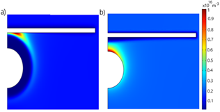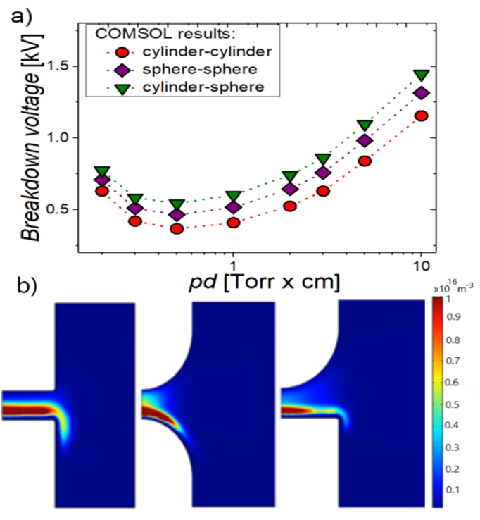 Figure 1 shows a) the breakdown voltage curves and b) the electron density distributions at the onset of breakdown for various electrode arrangements (cylinder-cylinder, sphere-sphere, cylinder-sphere). The breakdown occurs most easily when both electrodes are cylindrical. With decreasing the radius of the cathode it is easier to achieve the breakdown as illustrated in Figure 2. Electrical breakdown does not occur equally in both directions between positive and negative polarizations of the sphere-metal plate arrangement due to asymmetry (see Figure 3). The results presented here could be very useful for the design of surgical electrodes to prevent potential complications during electrosurgical procedures.