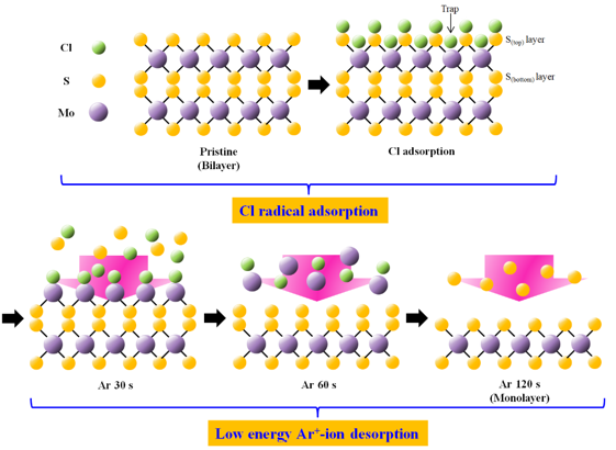 We are investigating an important TMD material, MoS2, which changes its bandgap from 1.2 eV (multilayer, indirect) to 1.9 eV (monolayer, direct). We performed atomic layer etching (ALE) of MoS2 multilayer material. We formed a single-multilayer heterojunction MoS2 from the multilayer MoS2 by partially masking the multilayer MoS2 using photoresist. For ALE of MoS2, Cl radical adsorption was performed using a remote ICP. The desorption of chemisorbed S-Cl, Mo-Cl, etc. on the MoS2 surface was carried out using an Ar+ ion beam which enables more precise control of ion energy compared to conventional etching systems.
