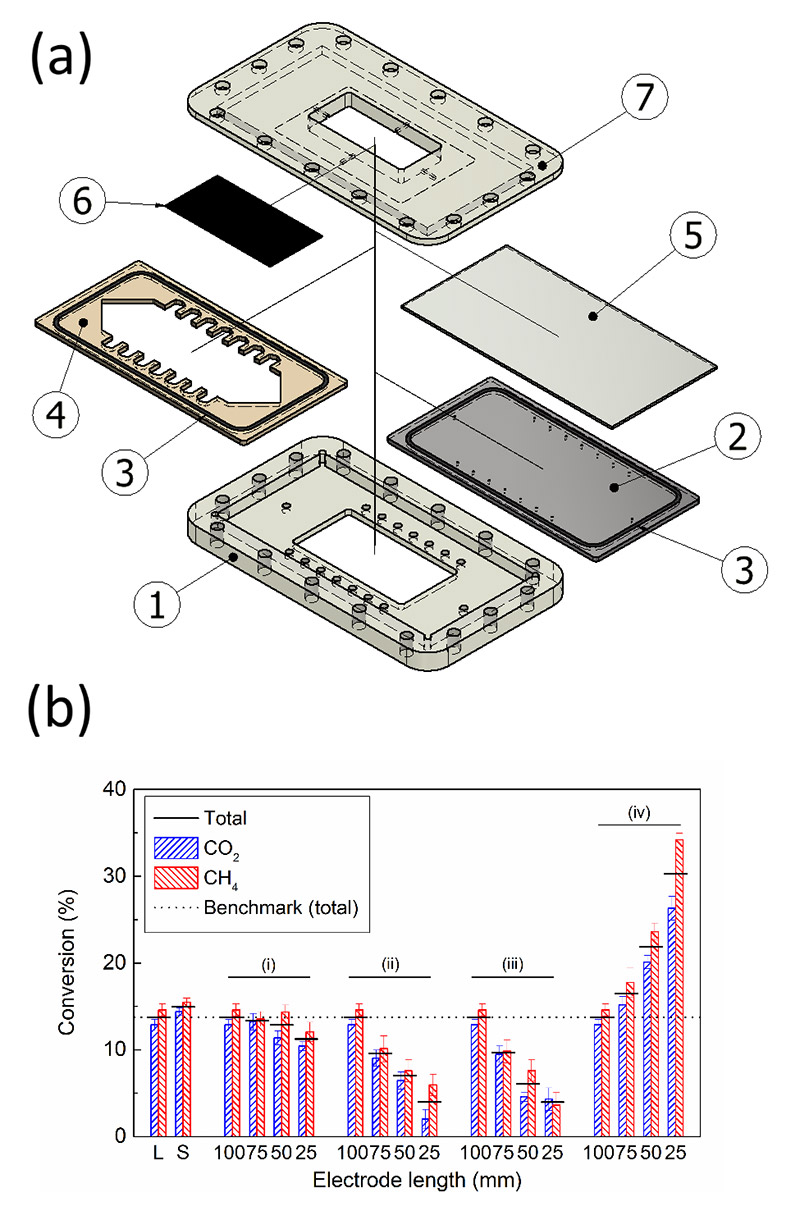 DBD plasma reactors are commonly used in static ‘one inlet – one outlet’ design that goes against reactor design principles for multi-component reactions, such as dry reforming of methane (DRM). We have developed a novel reactor design, and investigated how the shape and size of the reaction zone, as well as gradual gas addition, and the method of mixing CO2 and CH4 can influence the conversion and product composition of DRM. Even in the standard ‘one inlet – one outlet’ design, the direction of the gas flow (i.e., short or long path through the reactor, which defines the gas velocity at fixed residence time), as well as the dimensions of the reaction zone and the power delivery to the reactor, largely affect the performance. Using gradual gas addition and separate plasma activation zones for the individual gases give increased conversions, by optimizing mixing ratios and kinetics. The choice of the main (pre-activated) gas and the direction of gas flow largely affect the conversion and energy cost, while the gas inlet position during separate addition only influences the product distribution.