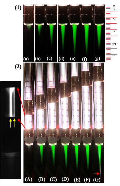 (2) Photograph of the APPJ at electrode gap (A) 10 mm, (B) 15 mm, (C) 20 mm, (D) 25 mm, (E) 30 mm, (F) 35 mm, (G) 40 mm. The b/w image represents the filaments formed between the electrodes for a gap of 10 mm.