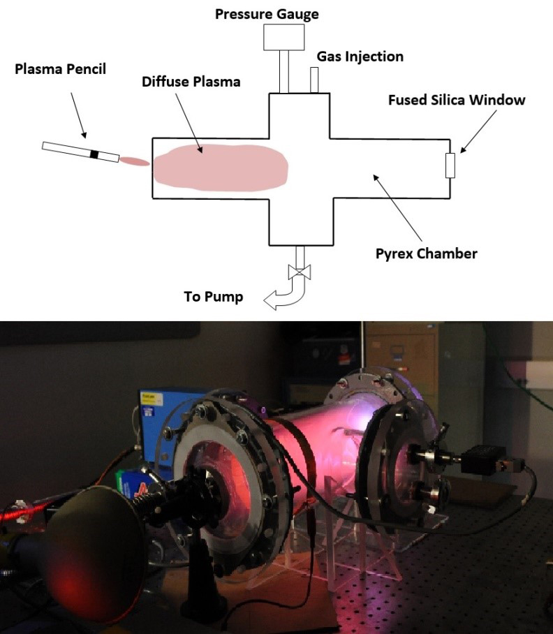 The figure shows a schematic of the experimental scheme and a photograph of the diffuse plasma generated in a Pyrex chamber filled with air at 3 Torr. The advantages of this generation method are that the plasma inside the chamber is free of metal contamination (since there are no electrodes) and unlike most low-pressure RF plasma sources (capacitively or inductively coupled), there is no critical requirement for impedance matching since the driving circuitry of the plasma jet is electrically separate/remote from the chamber, which itself has no internal or external hardwired electrical connections.