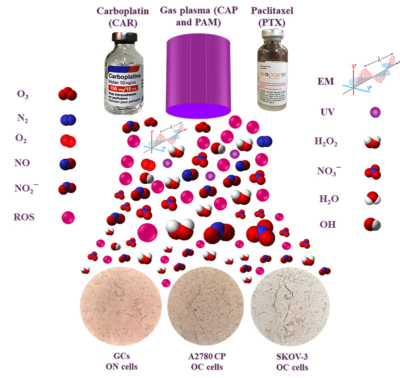 Recently, medical gas plasma technology has emerged as an oncotherapeutic modality through physical and chemical effects. Here, gas plasma directly, indirectly, and through the concomitant modality of plasma activated medium (PAM) with conventional drugs were utilized on A2780 CP and SKOV-3 cells. These studies are relevant to ovarian cancer and granulosa cell (GC) as normal ovarian cells to overcome chemotherapy resistance in ovarian cancer cells. We showed that PAM in comparison to cold atmospheric plasma (CAP) has a high potential and stronger selectivity for the selected cell lines, where the concentration of H2O2, NO2-, and NO3- reactive species and the pH of plasma treated medium plays the main role. Furthermore, the PAM-based treatment is very promising for ovarian cancer treatment compared to the combination of common carboplatin (CAR) and paclitaxel (PTX) chemotherapy treatments. Regarding the molecular mechanisms, PAM alone and concomitantly with carboplatin sensitizes cancer cells to carboplatin and selectively induces mitochondrial‐related intrinsic apoptosis. In essence, PAM treatment is an innovative and emerging technology for the future combination or multimodal ovarian cancer oncotherapy.