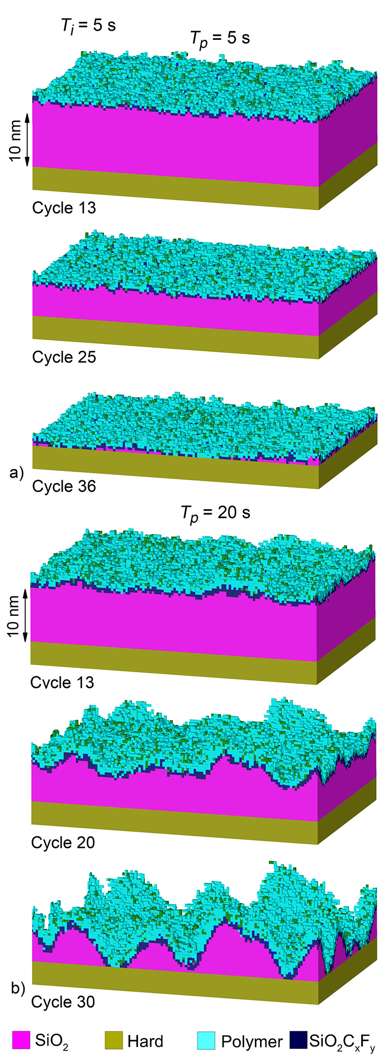 Reactor and feature scale simulations of ALE of SiO2 demonstrate this potential for roughening. The ALE process consists of a 2-frequency capacitively coupled plasma (step 1) sustained in Ar/C4F8/O2 for passivation and (step 2) an Ar plasma for chemical sputtering. The figure shows (top) a quasi-steady state ALE process having a passivation period of 5 seconds. For a longer passivation period of 20 s (bottom), chemical sputtering does not removal all of the polymer each step, resulting in eventual roughening of the surface.