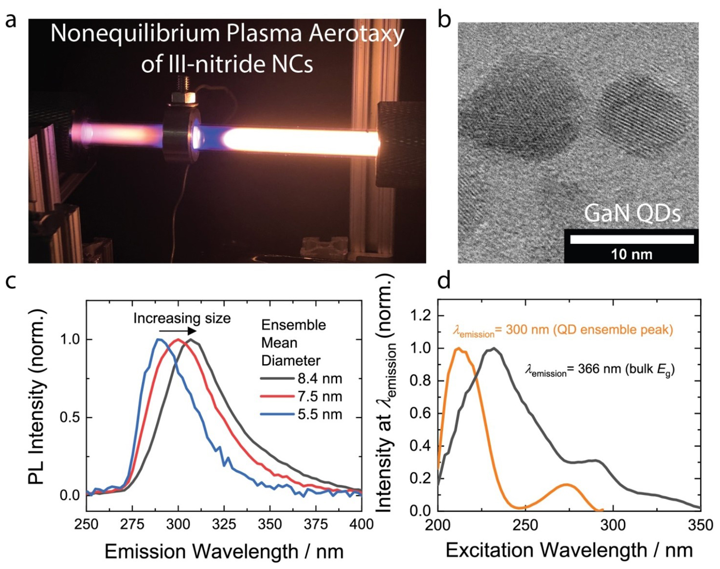 LTPs are a unique environment to produce nano-particles having unique physical, chemical and optical properties. Here we synthesized GaN quantum nano-dots. (a) Image of the plasma reactor during operation. (b) High-resolution TEM image of GaN nanocrystals in the size range of quantum confinement. (c) Photoluminescence spectra for different mean diameters under 216 nm excitation. (d) Photoluminescence excitation spectra monitoring emission from bulk GaN nanocrystals (grey, 366 nm emission) and quantum-confined GaN nanocrystals (orange, 300 nm emission). This work was supported by the Army Research Office (W911NF-18-1-0240) and was performed in part using the facilities at the Institute for Materials Science and Engineering at Washington University.Prof. Elijah Thimsen, Washington University-St. Louis, USA, elijah.thimsen@wustl.edu.
