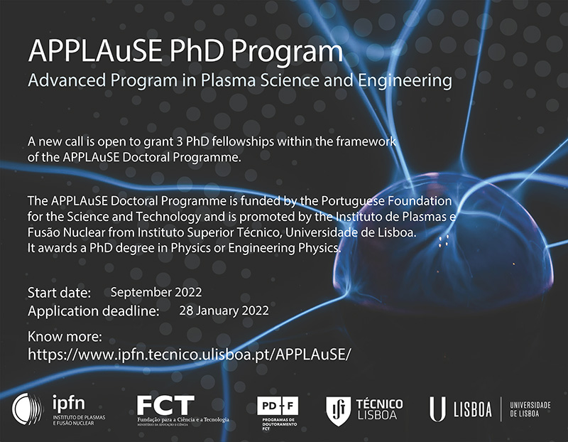 APPLAuSE is a doctoral program on Plasma Science and Engineering consisting in a student-centered and highly modular PhD program designed to enhance each student’s capabilities and maximize his/her potential. The APPLAuSE Doctoral Programme is funded by the Portuguese Foundation for the Science and Technology and is promoted by the Instituto de Plasmas e Fusão Nuclear from Instituto Superior Técnico, Universidade de Lisboa, Portugal.