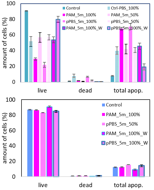 The anticancer effects depend on the plasma treatment time and PAL concentration. The first 30 min of cancer cell incubation in PAL were enough to start processes leading to cell death. In normal fibroblasts, no apoptosis induction was observed even for 24 h incubation, and only PAPBS, activated for a longer time, slightly decreased their viability. Effects of PAM and PAPBS on cancer cells showed selectivity compared to normal fibroblasts, depending on correctly chosen activation time and PAL concentration, which is very promising for potential clinical applications. This selectivity effect of PAL is conceivably induced by plasma-generated reactive species, especially hydrogen peroxide.