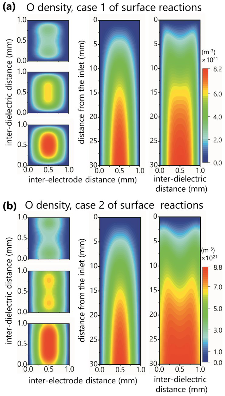 Critical for the densities of the neutral species are the surface reaction probabilities (SRPs) on dielectrics, which depend on pressure, temperature, gas mixture, and surface roughness. For case 1, the same values for SRPs on electrodes and dielectrics are considered, and O density decreases close to the dielectrics. For case 2, low values of SRPs for neutral species are assumed on dielectrics (10-4), and O density has a flatter profile along the inter-dielectric direction.
