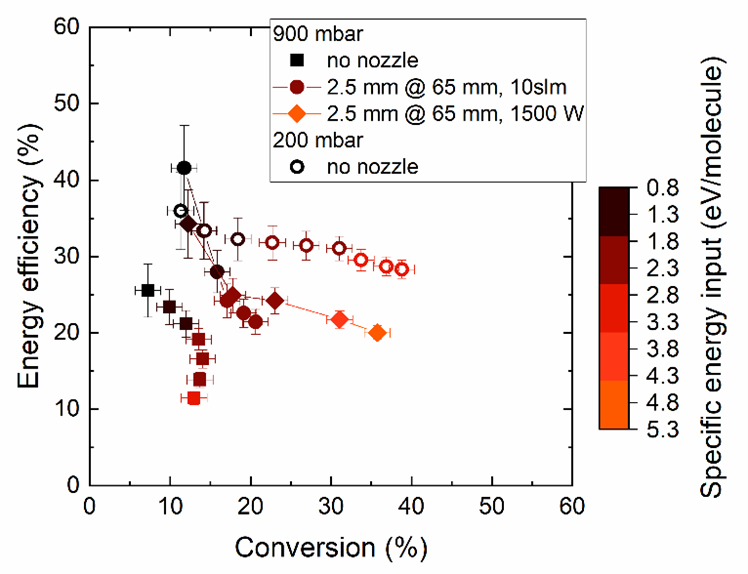 The results obtained using the nozzle demonstrate an enhancement of both conversion and energy efficiency, particularly at pressures close to atmospheric pressure and for lower CO2 flows (SEI above 2 eV/molecule). The conversion and energy efficiency obtained without the nozzle plotted in Figure 2 show the strong decrease of the performance for 900 mbar when compared to 200 mbar. By using the nozzle, it is possible to significantly increase the performance of the plasma torch at a pressure of 900 mbar, both in conversion and energy efficiency towards values previously achieved only at 200 mbar with the standard design.