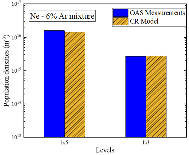 Rare gas mixture plasmas have applications such as increasing plasma thruster’s ionization and streamer current in plasma jets. Accurate information about plasma parameters, such as electron temperature, electron density, and metastable populations, is essential for understanding plasma characteristics and improving efficiency. Optical emission or absorption spectroscopic (OES or OAS) measurements coupled with a Collisional Radiative (CR) model are an efficient diagnostic technique.