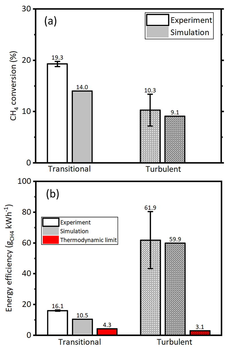 This work reports on the operation of a rotating gliding arc (RGA) reactor at a high flow rate and the effect of flow regimes on its chemical performance. When the flow regime was changed from transitional to turbulent flow (5→50 SLPM), the operational mode transitioned from glow to spark type. The average electric field, gas temperature, and electron temperature increased (106→156 V⋅mm−1, 3681→3911 K, and 1.62→2.12 eV). The decomposition’s energy efficiency for methane (ηE) increased by a factor of 3.9 (16.1→61.9 gCH4⋅kWh−1). The first three dominant methane consumption reactions (MCR) for both the flow regimes were induced by H, CH, and CH3 (key-species), yet differed by their contribution values. The MCR rate increased by 80–148% [induced by electron impact and singlet N2], and decreased by 34–93% [CH, CH3, triplet N2], due to turbulence. The electron-impact processes generated at least 50% more of key-species and metastables for every 100 eV of input energy, explaining the increased ηE with turbulent flow. So, flow regime influences the plasma chemistry and characteristics through flow rate. The reported RGA reactor is promising to mitigate hydrocarbon emissions with high energy efficiency at a large scale while requiring some optimization to improve conversion.