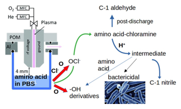 The principal chemical process in treated media or amino acids solution in PBS involved the formation of monochloramines and dichloramines depending on the O atoms dose. The plasma treated medium (PTM) treated with lower doses possessed post-discharge reactivity characterized by the decay of monochloramines to aldehydes during approximately 2h after the treatment. The head-space FTIR and TBA-assay confirmed the presence of aldehydes in samples (1 ml) treated for more than 10 min with a certain amount of malondialdehyde (< 2 uM). In the case of phenylalanine treatment, the presence of nitrile for higher treatment times was confirmed by HPLC. In the case of leucine, isovaleronitrile was detected by GC-MS. These findings are indirect evidence of dichloramine formation. It was further found that this dichloramine formation is connected with bactericidal properties of plasma treated amino acids towards E.coli bacteria. The bactericidal effect was also triggered even with shorter treatment times by artificial acidification of treated solution to pH 3. Such acidification promotes disproportionation of organic monochloramines to dichloramines which decay to unidentified toxic products.