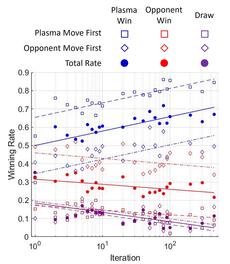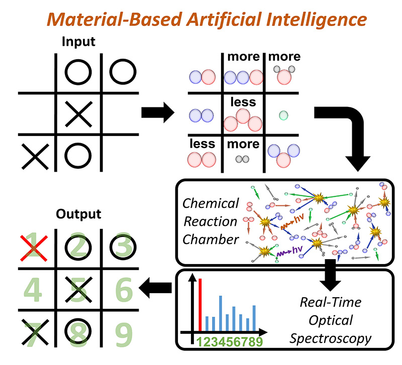 A theoretical derivation of the mathematical similarity between CPN and ANN is introduced and followed by an example of training the CPN of a low-temperature plasma to play the board game Tic-Tac-Toe. In each plasma’s turn, a combination of 9 gases is input to the plasma generator and each type of gas represents a position on the board. The gas mixture represents the board status by the mixing rate of each gas (Fig. 1). The plasma chemistry will thus behave accordingly and finally emit spectra indicating the plasma’s next move. In Fig. 2, at the first iteration of training, the plasma has a winning rate of around 50% against its random-move opponent, meaning that the plasma plays randomly. At the 450th training iteration, the plasma’s winning approached about 70%. This means that the plasma acquired an AI to play with logic and strategies. This work reveals that any matter, with substantial chemical complexity, can process information based on particle collisions, like a programmable analog computer at the molecular level.