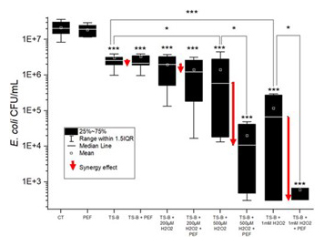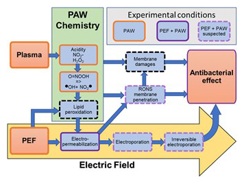 The results suggest that the interaction with radicals during the bacteria exposure to PAW leads to an antibacterial effect reinforced by the PEF, hence showing a synergy of the chemical and physical plasma agents. This opens new perspectives for applications both plasma and PEF areas of research.