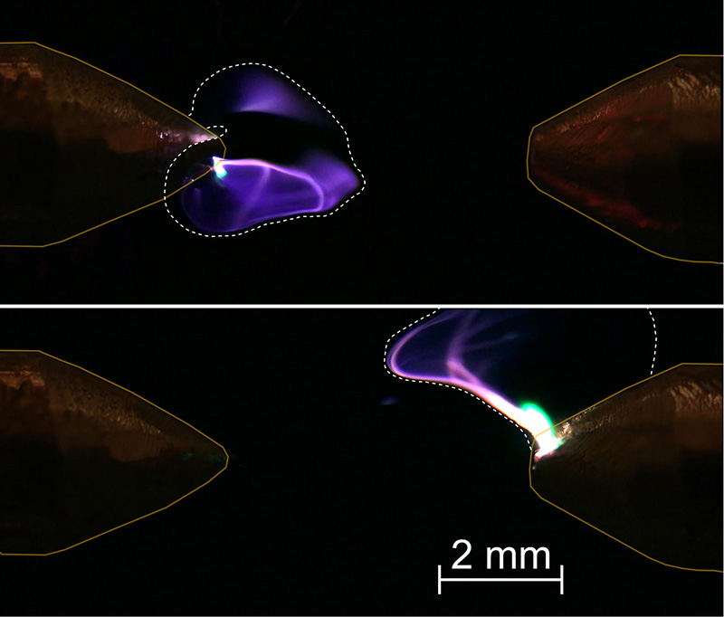 The image is part of the manuscript: “Plasma Breakdown in Bubbles Passing Between Two Pin Electrodes”, Naveen Pillai et al., under review (Journal of Physics D: Applied Physics). Nicholas Sponsel (lsponse@ncsu.edu) and Prof. Katharina Stapelmann (kstapel@ncsu.edu), North Carolina State University, USA.