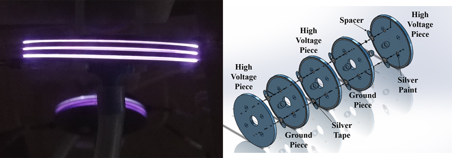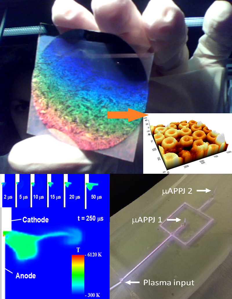 Bottom right: Atmospheric pressure microplasma jets (μAPPJs) generated through microfluidic channels. Device fabricated in Prof. Z. Li’s Lab, George Washington University.