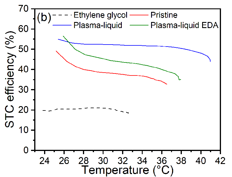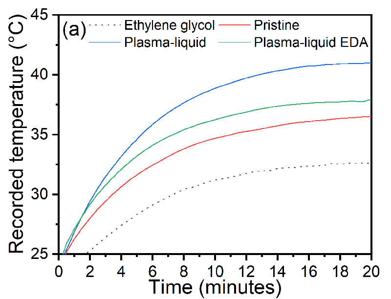 We have used plasma-induced non-equilibrium electrochemistry to functionalize the surface of macroscopic ribbon-like assemblies of carbon nanotubes (CNTs) and enhance their dispersion within ethylene glycol for application in solar-to-thermal energy conversion. In particular, the nanofluids with CNTs that showed a combined nitrogen-based and high oxygen-based functionalisation—the “plasma–liquid” samples—performed exceptionally well. These showed a reduction in the contact angle from 84° to 35°, along with corresponding improvements in hydrophilicity and dispersion, leading to the enhance-ment of the absorption coefficient, reaching values greater than 2 cm−1 at 600 nm, with much greater values above 5 cm−1 observed at the logarithmic Van Hove peak at 256 nm. Solar thermal conversion experiments show that this “plasma–liquid” additive results in the greatest temperature increase—to above 40 °C—as well as a solar–thermal conversion efficiency of 50%. The long-term performance of the treated nanofluids was assessed, with values of 80% incident radiation absorption retained after 67 months of storage, with only a brief manual shake required to fully redisperse the material prior to UV–Vis measurements, highlighting the readiness for industrial application.