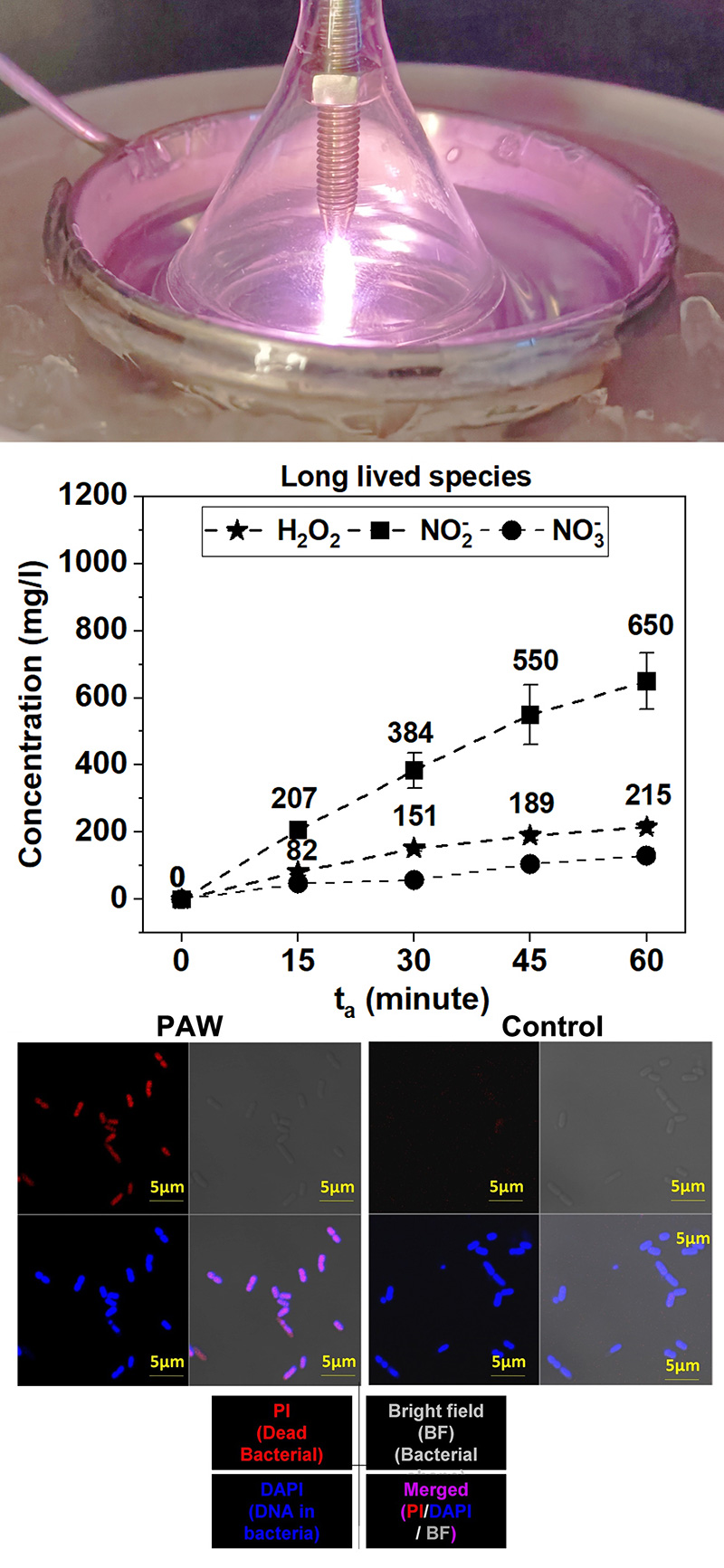In recent decades, multidrug resistance (MDR) in bacterial infections has become a looming health and economic burden. MDR severity exaggerates hospital infection rates, especially for patients with an impaired immune system. As a result, lowering the bacterial burden is of significant concern. Plasma activated water, with its rich and diversified aqueous reactive nitrogen and oxygen species (RONS), is emerging as an alternative green technique in biomedicine.