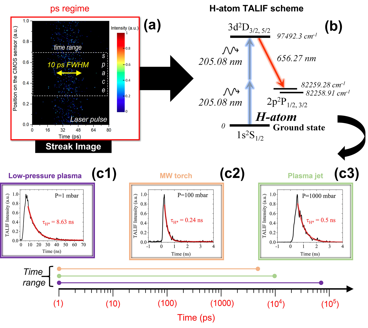 We present an advanced diagnostic platform involving an ultrafast picosecond (ps) laser and a streak camera for measuring absolute atomic densities in reactive plasmas. The temporal profile of the laser pulse (a; 10 ps FWHM around 205 nm) can be captured by the streak camera (few ps time resolution). In the streak image shown in (a), the horizontal axis represents the time domain while the vertical axis refers to the space domain of the measurement (shown as position on the CMOS sensor of the streak). The laser and streak can be combined to perform Two-photon Absorption Laser Induced Fluorescence (TALIF) studies in discharges operating at low pressures (P). Moreover, due to the high temporal resolution, TALIF studies even at atmospheric pressure are feasible, where the quenching of laser-excited states becomes significant, thus complicating the application of classic ns–TALIF and –detectors. Here we illustrate ps–TALIF measurements of effective lifetimes (τH*) of atomic hydrogen (an typical TALIF scheme is shown in (b)) in three reactive plasmas: microwave H2 plasma (c3; P=1 mbar; τH*=8.63 ns), microwave Ar/CH4 plasma torch (c1; P=100 mbar; τH*=0.24 ns), and atmospheric pressure helium plasma jet (c2; τH*=0.5 ns). The accurate determination of these lifetimes is key to achieving more reliable measurements of H-atom absolute densities for different applications.