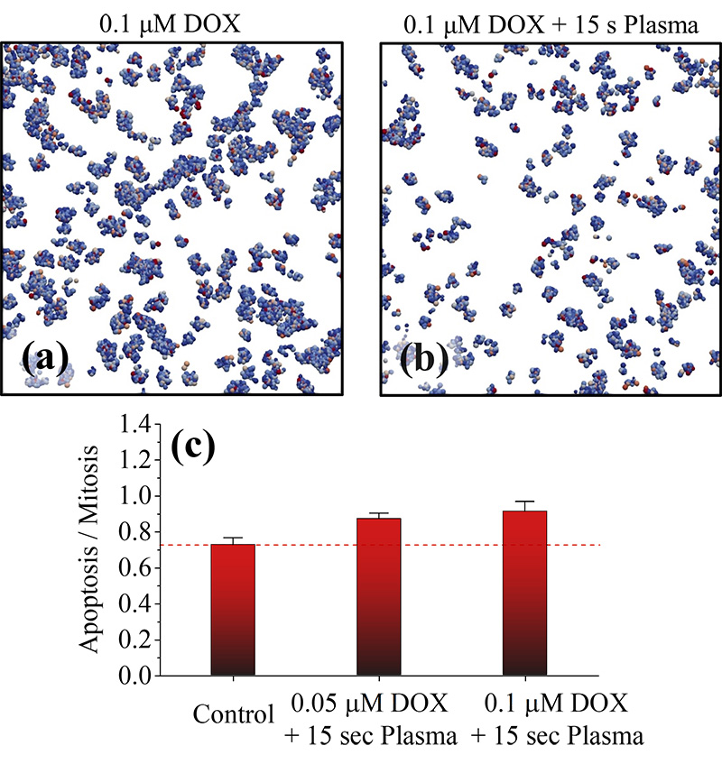 The model reveals an impact on Ncell, %PApoptosis, or/and %PMitosis of each treatment depending on the plasma duration and DOX concentration without using any flow cytometry experiments. Indicative simulations are shown in the image, revealing the effect on B16F10 cell dynamics of DOX alone, and combined DOX and direct APPJ treatments. Although our study here is focused on melanoma cell apoptosis and mitosis, other cell phenotypes (e.g., glioblastoma) and mechanisms (e.g., growth, migration, differentiation, etc.) can be specified in the model depending on the biology involved, treatment type, and application. Thus, the agent-based model can be expanded by adding more complexity such as plasma reactive species interaction pathways with cancer cells in different liquid media. As more evidence is provided to refine the model, the broader its applicability to explore more elaborate cancer treatment strategies.