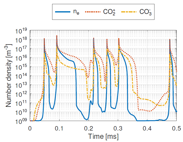 Our calculations show maximum electron and CO2+ densities in the order 1020 m−3 , an average discharge power of 353.42 W/m in the first cycle, microdischarge (MD) peak currents in the order of 50-400 A/m, total half-cycle plasma charge of around 6 µC/m, which compare well with experimental findings. Dominant negative ions are found to be CO3−. CO molecules and O atoms are mainly formed during the MDs development and the streamer-surface ionization waves. Molecular oxygen (O2) is preferentially formed during the glow, current-decaying and afterglow phase of each microdischarge. The spatially average reduced electric field inside the reactor lies in the 20-100 Td range.