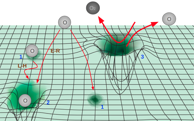 A novel mesoscopic model is developed for atomic oxygen surface kinetics on silica-like walls, introducing a plasma-induced surface modification, which may impact intermediate pressure plasma reactors. The model is the first to reproduce experimental measurements in an oxygen glow discharge operating in the pressure range between 0.27 mbar (0.2 Torr) and 4 mbar (3 Torr), showing a decrease with pressure of the O recombination probability on Pyrex between 0.27 mbar and 1 mbar. The numerical simulations suggest that a modification is induced by the production and destruction of metastable chemisorption sites at the surface. As such, the Langmuir–Hinshelwood (L-H) and Eley-Rideal (E-R) recombination mechanisms take place involving not only physisorption and stable chemisorption sites, but also metastable chemisorption sites, produced by the impact of fast O2 ions and neutrals. The presence of metastable sites can be reversed by increasing the plasma pressure.