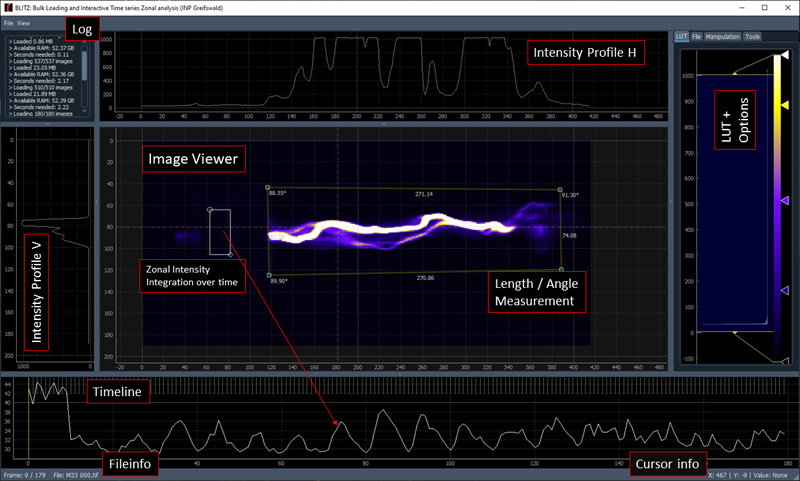 Efficient image analysis is crucial in plasma research, where handling extensive image series is challenging. Traditional viewers struggle with large datasets, and while macros help, they require expertise and considerable computing time. The INP introduces “BLITZ,” a Python-based image viewer using QT and PyQTGraph, designed for rapid performance and scalability. It supports fast loading of large image series, with performance dependent on CPU cores and RAM configuration. BLITZ offers scale reduction, subsetting, and bit depth conversion for loading images.