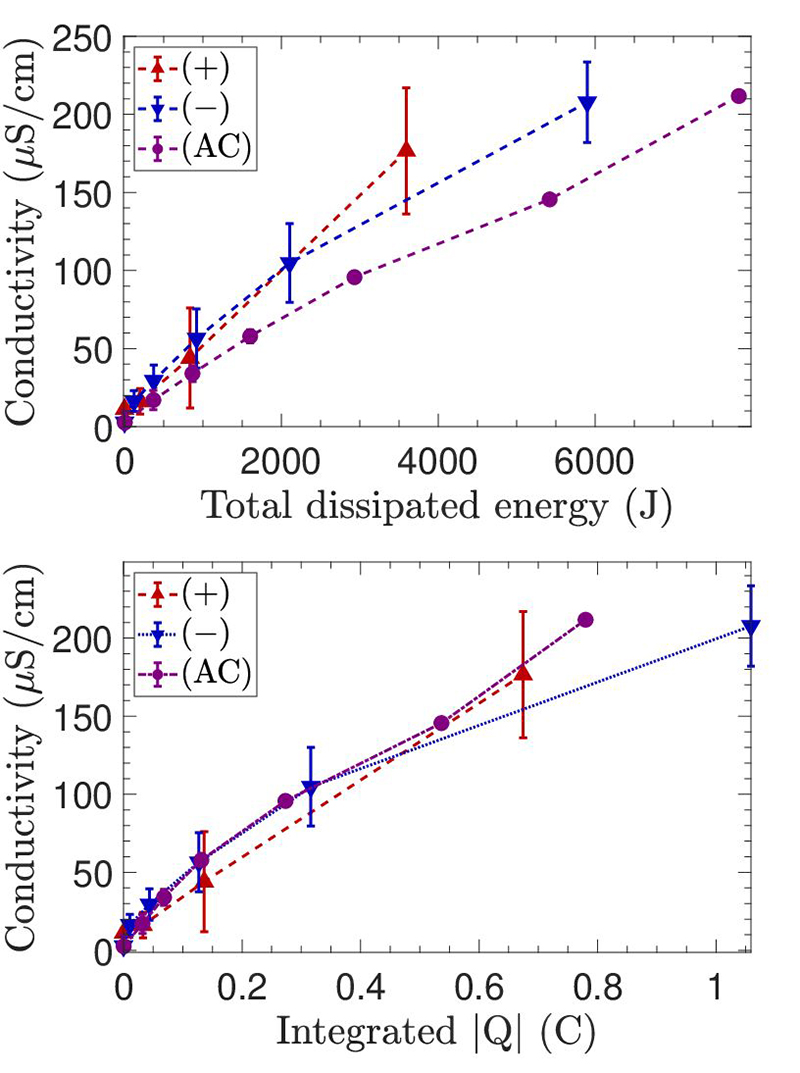 The resulting water conductivity was found to be a function of the total dissipated energy, irrespective of the discharge driving mode. Additionally, the resulting water conductivity shows a strong correlation with the total transferred charge in the gas phase. The total dissipated energy can potentially be used as a global measure to compare different experiments involving plasma-water interaction across different setups in different research groups.
