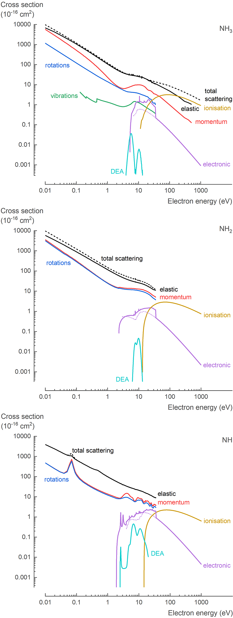 Plasma-assisted NH3 synthesis and decomposition are gaining increased attention for their potential role in sustainable electron-driven nitrogen fixation and hydrogen carrier reforming. To further advance these applications, an accurate description of the electron-induced chemistry is essential. However, a complete set of low-energy cross section data was not available for the electron collisions with ammonia (NH3) and its radicals, amidogen (NH2) and imidogen (NH).
